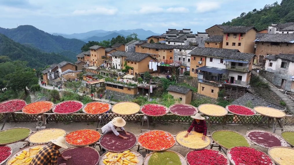 每至金秋收获时节,歙县阳产村人会巧借窗台屋顶晒出各种农作物,铺展丰收,半山盛景,吸引国内外游客纷至沓来。