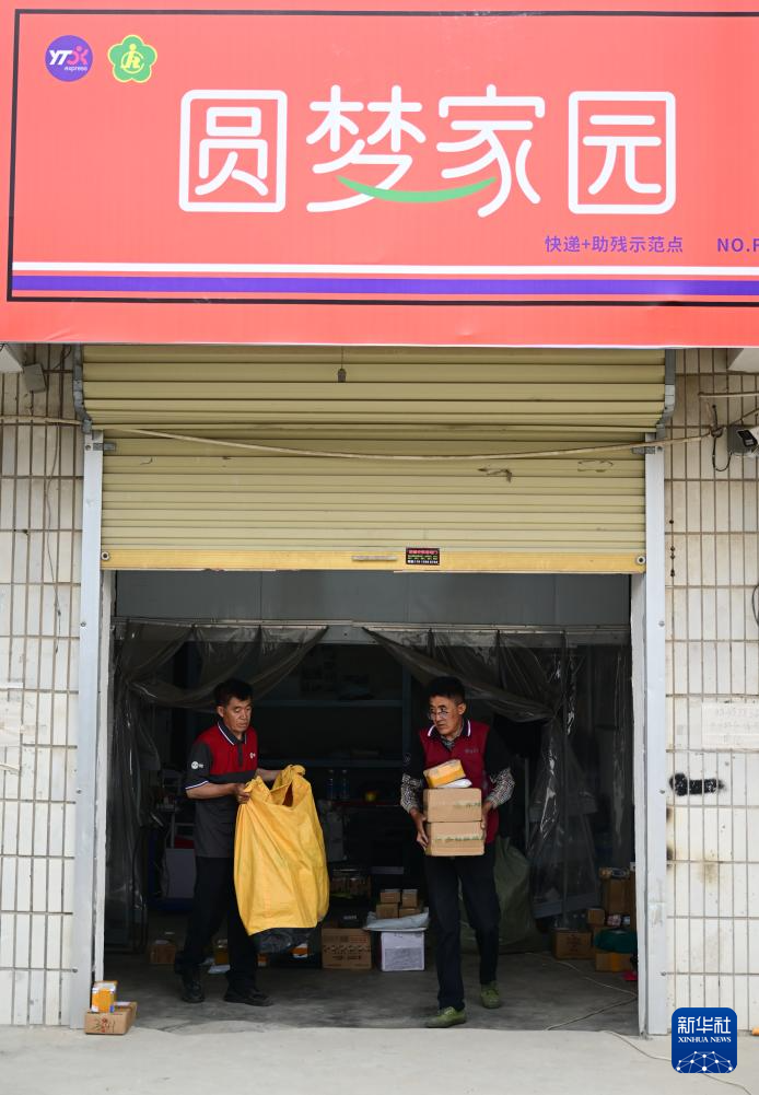 5月15日,徐以炳(左)在整理快递件。今年60岁的徐以炳患有三级腿部残疾,2025年,他在“圆梦家园”助残驿站实现就业。