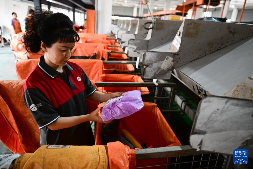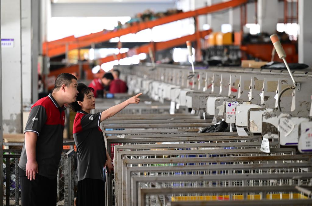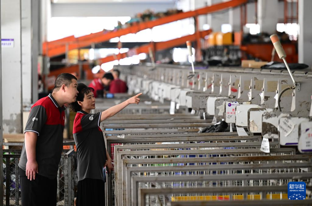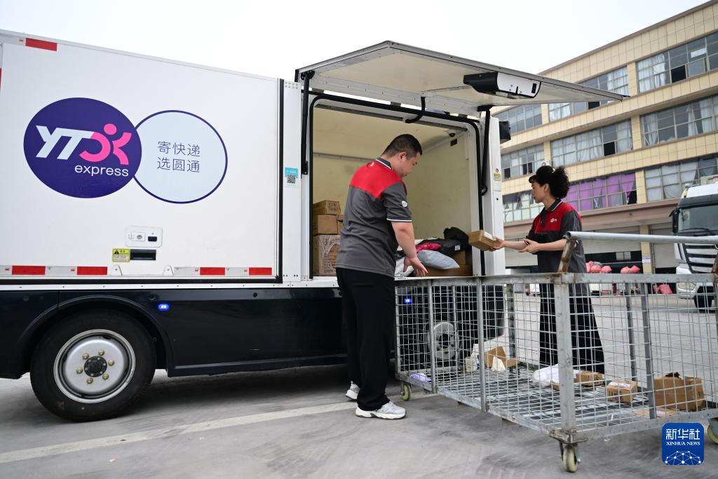 5月16日,在阜阳市圆顺通物流有限公司,刘苓苓(左二)在物流基地查看快递件。