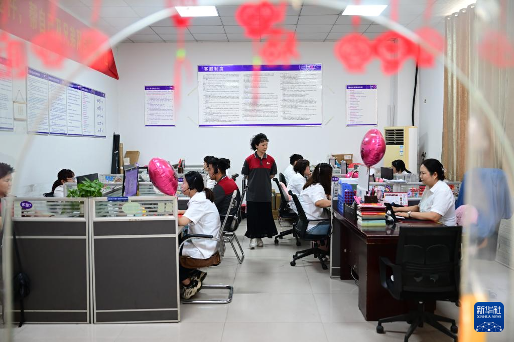 5月16日,在阜阳市圆顺通物流有限公司,刘苓苓(中)在客服部门查看。