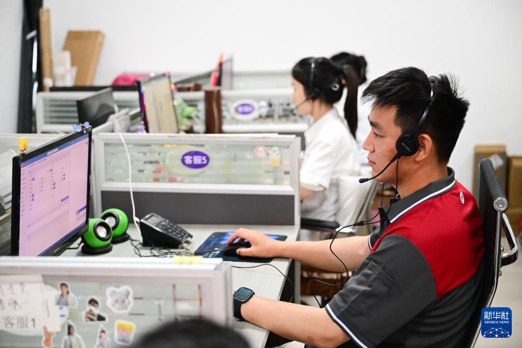 5月16日,在阜阳市圆顺通物流有限公司,纪长振(前)在接听电话。今年29岁的纪长振患有二级腿部残疾,2022年,他应聘来到阜阳市圆顺通物流有限公司担任客服部工作人员。
