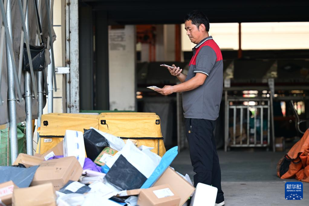 5月15日,在阜阳市圆顺通物流有限公司,刘苓苓在物流基地查看快递件。