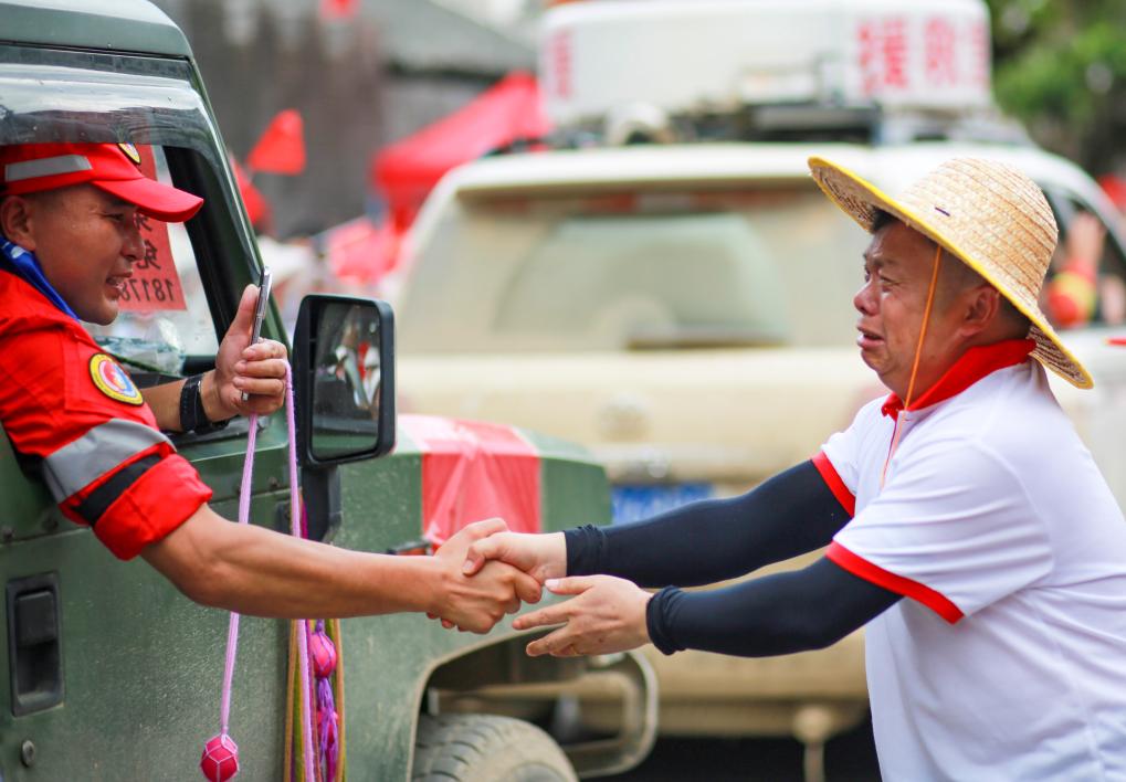 2025年7月3日,在贵州省榕江县,一名救援队员在撤离时与当地居民握手道别。新华社发(龙顺伟摄)
