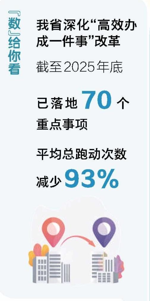 我省深化“高效办成一件事”首创性、差异化改革,着力打造集约高效的政务服务领域一流营商环境。数据显示,截至2025年底,已落地70个重点事项,平均总跑动次数减少93%,办理总时限压缩65%,提交材料减少60%,其中国家部署4批42个重点事项全面推进、已落地41个,平均集成单事项由国家部署的6个提升至8个。