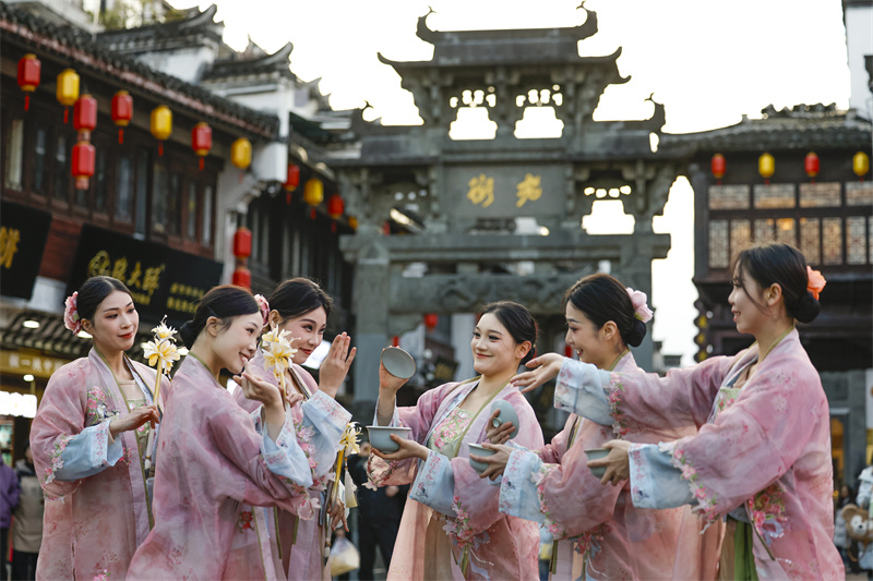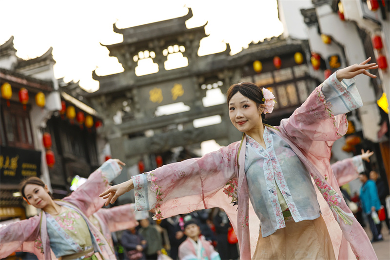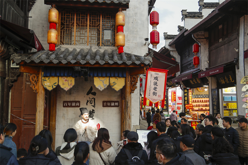 当日,“来屯嬉”沉浸式演绎活动在黄山市屯溪老街精彩上演。身穿古风服装的演员以灵动的舞姿,演绎出《清明上河图》中的市井繁华画卷,沿街设置的NPC(非玩家角色)与游客趣味互动,共同迎接新年。新华网发(施亚磊 摄)