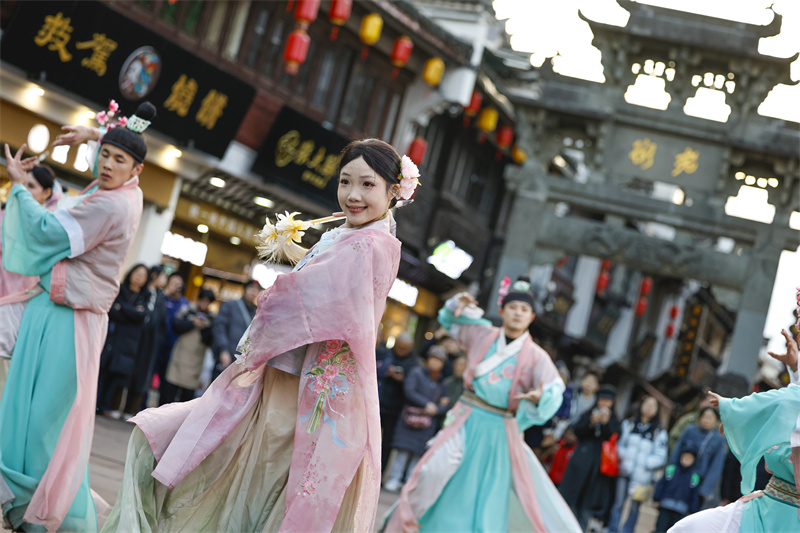 2025年12月31日,演员在安徽省黄山市屯溪老街表演国风舞蹈剧。