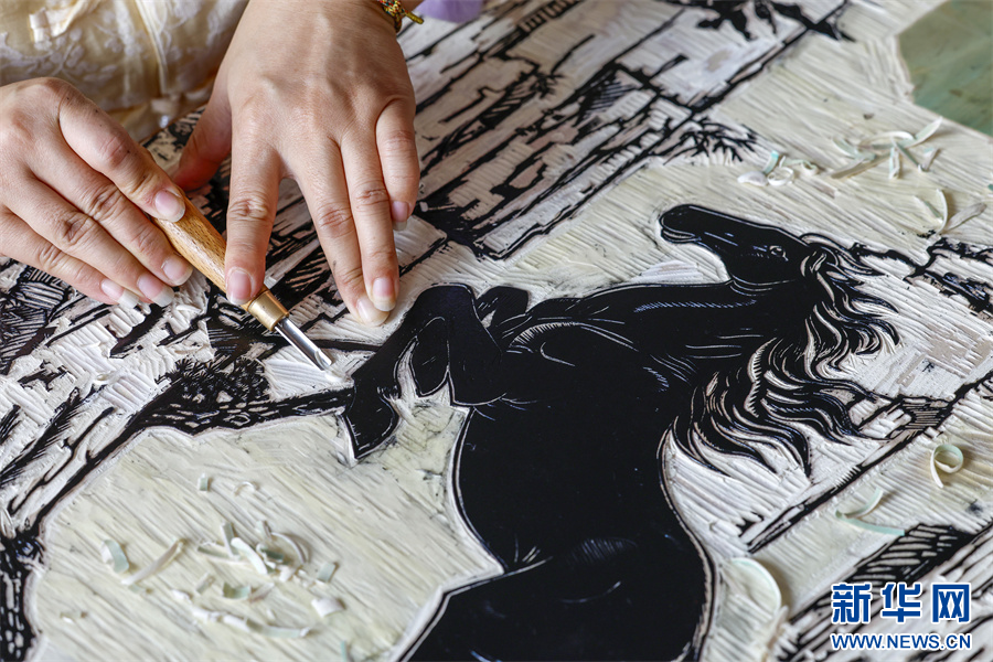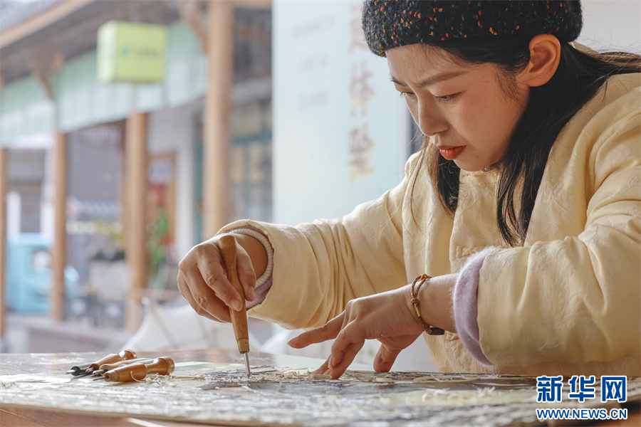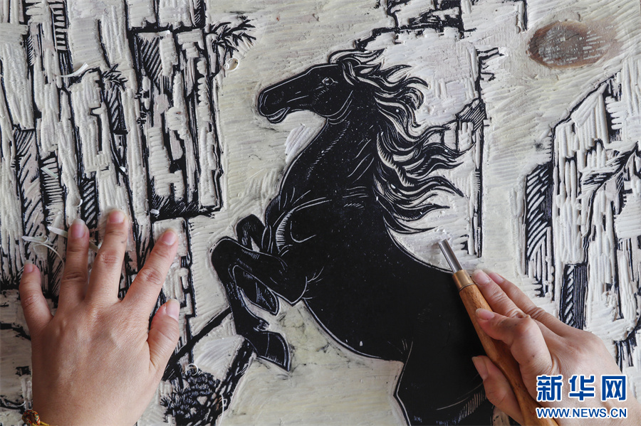 当日,在安徽省黄山市屯溪区河街,市级非遗项目(徽派版画)代表性传承人薛寅以刀为笔,在木板上沉稳推凿,将一匹姿态昂扬的骏马融入方寸之间。作品寓意“奋进吉祥”,以精妙的非遗技艺迎接马年新春。新华网发(施亚磊 摄)