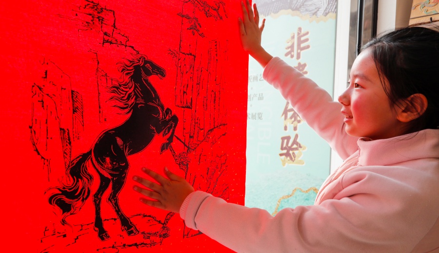 1月6日,在安徽省黄山市屯溪区河街,孩子在张贴版画《骐骥驰骋》。
