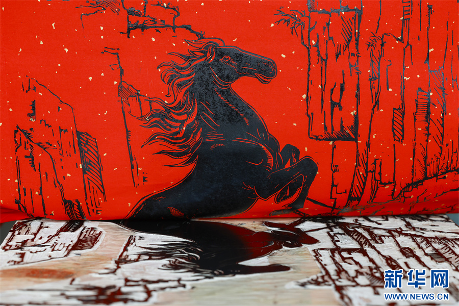 1月6日,在安徽省黄山市屯溪区河街,市级非遗项目(徽派版画)代表性传承人薛寅制作的拓印版画《骐骥驰骋》。