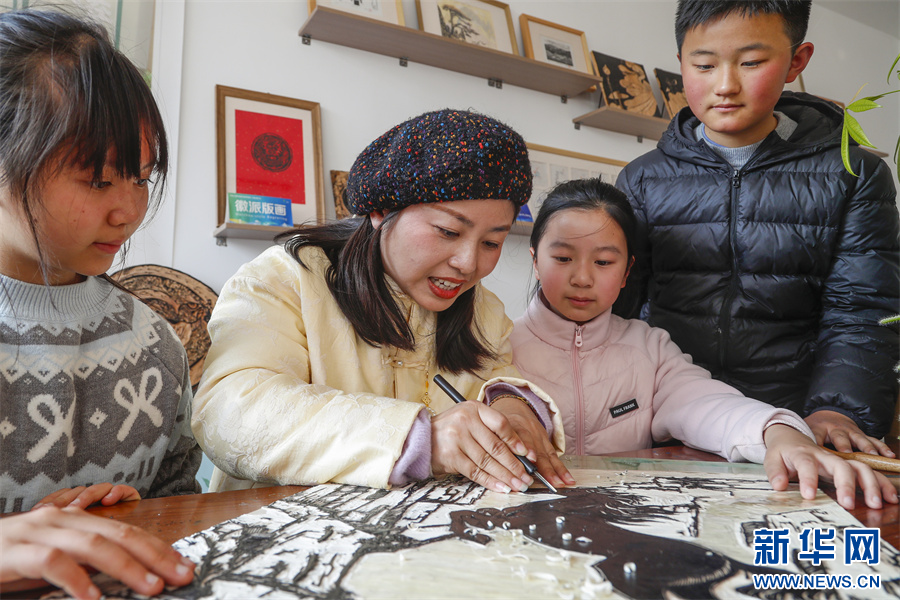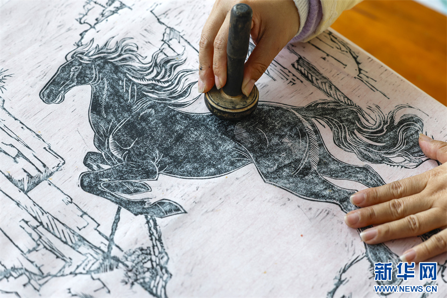 1月6日,在安徽省黄山市屯溪区河街,市级非遗项目(徽派版画)代表性传承人薛寅在拓印版画《骐骥驰骋》。