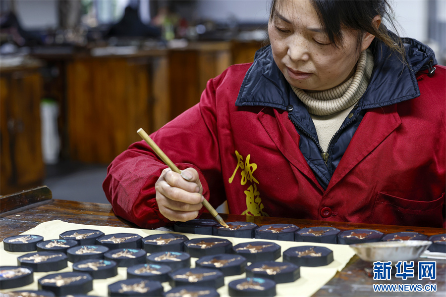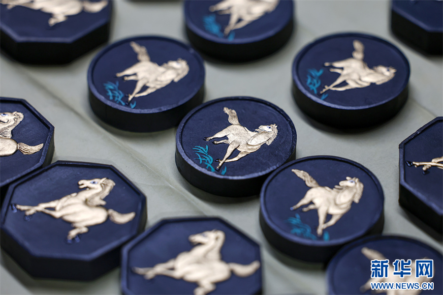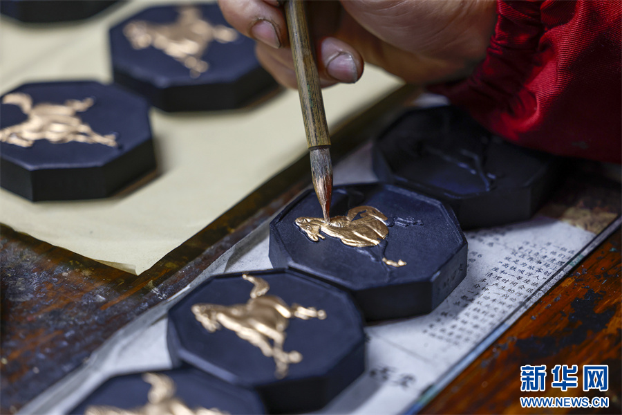 近日,在安徽省黄山市歙县老胡开文墨厂,制墨手艺人正在制作马年主题徽墨。