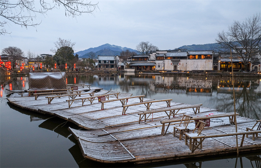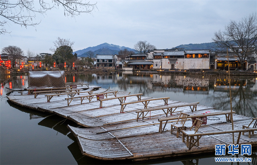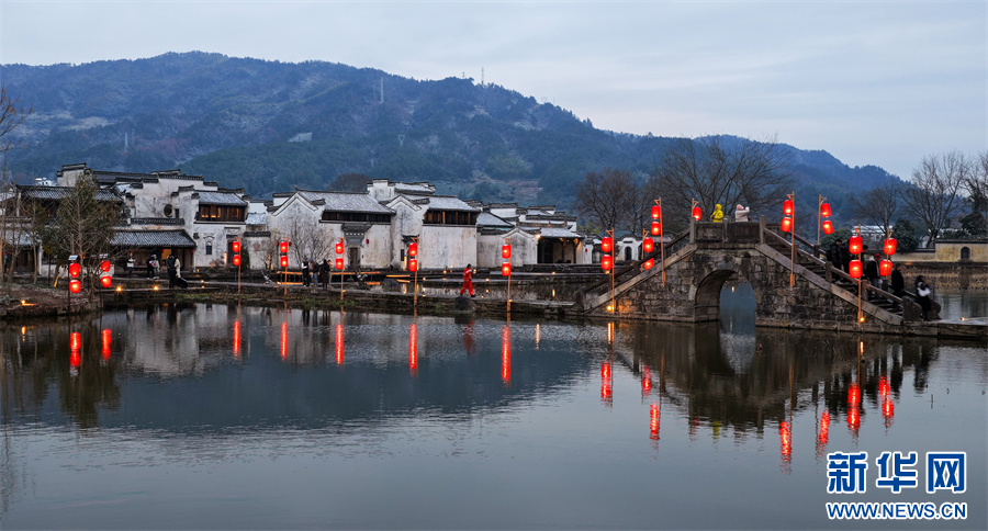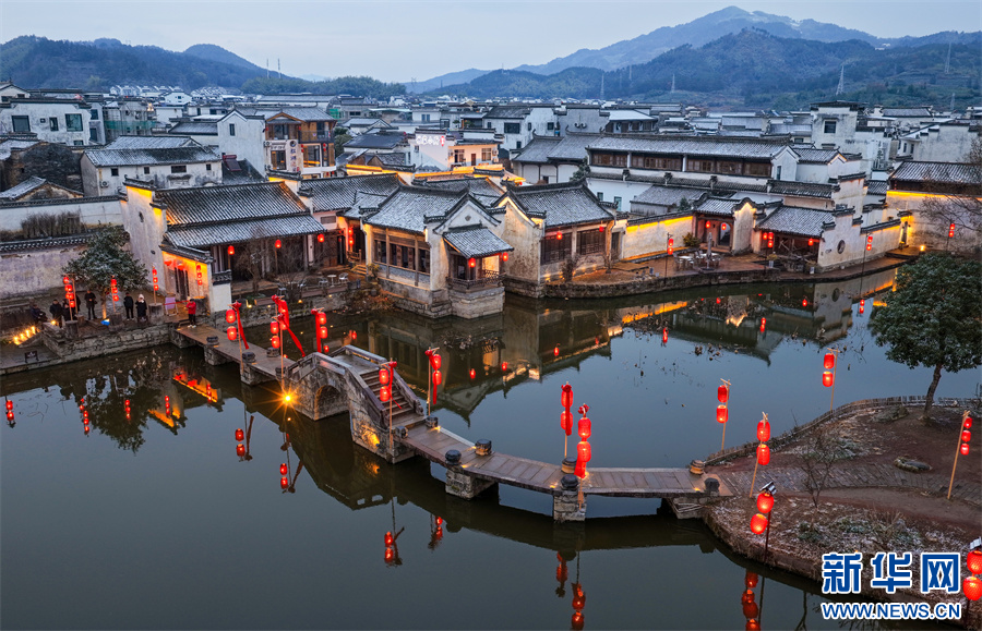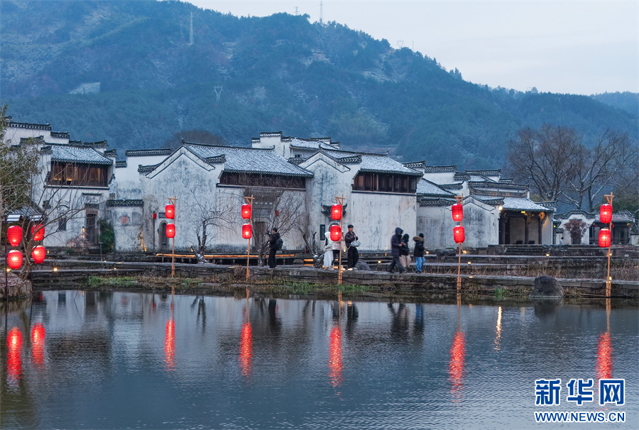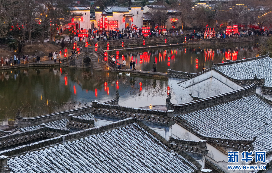 当日,安徽省黄山市徽州区呈坎古村迎来入冬首场降雪,粉墙黛瓦银装素裹,皑皑白雪与串串红灯笼交相辉映,构成一幅独具韵味的冬日画卷。新华网发(施亚磊 摄)