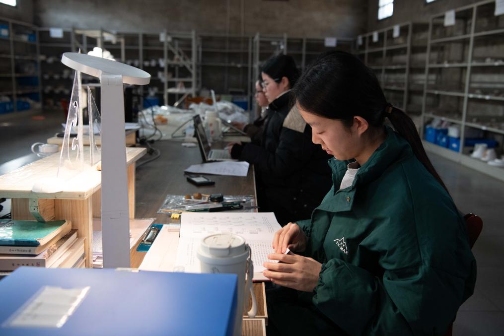 2026年1月13日,在凌家滩遗址考古工作站,考古人员对出土文物进行研究。新华社记者 张端 摄