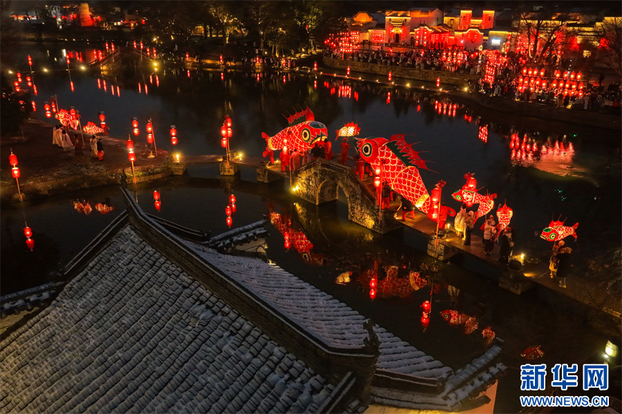 当日,安徽省黄山市徽州区呈坎古村迎来入冬首场降雪,鳞次栉比的徽派民居银装素裹,鱼灯队伍舞动巡游,光影流动,与皑皑白雪交相辉映,宛若浪漫梦境。新华网发(施亚磊 摄)