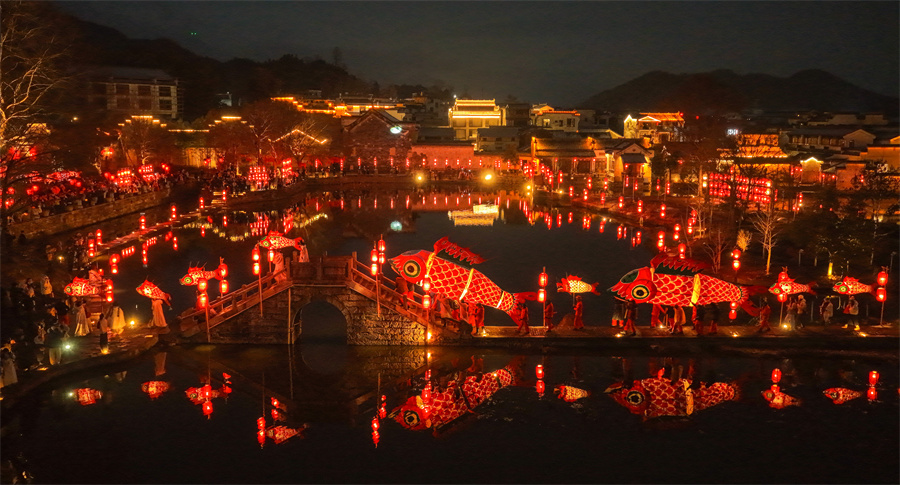 1月20日,安徽省黄山市徽州区呈坎古村,鱼灯队伍在雪夜起舞巡游(无人机照片)。