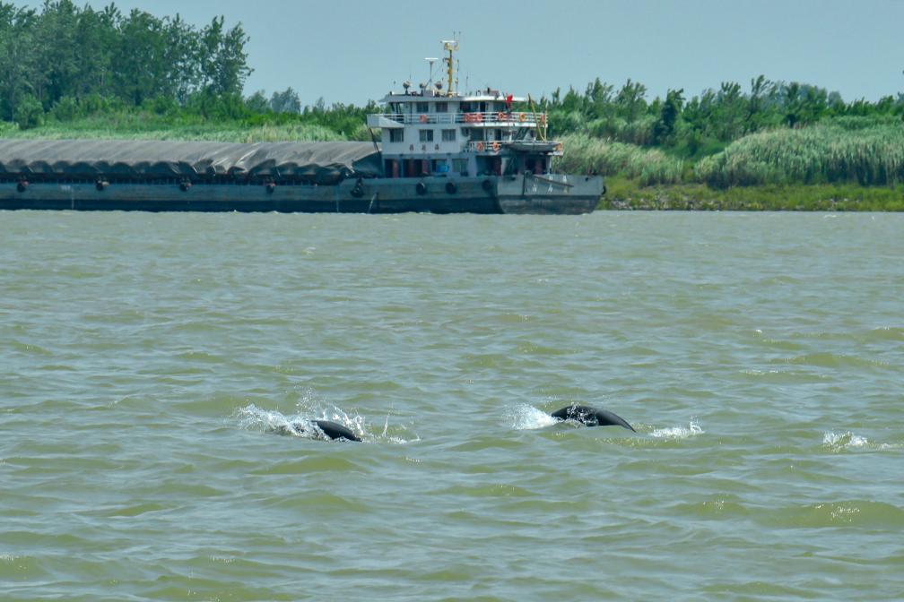 2025年5月21日,安徽省铜陵市义安区胥坝乡附近江面上,多头野生江豚不时跃出水面,尽情逐浪长江。(储著传 摄)