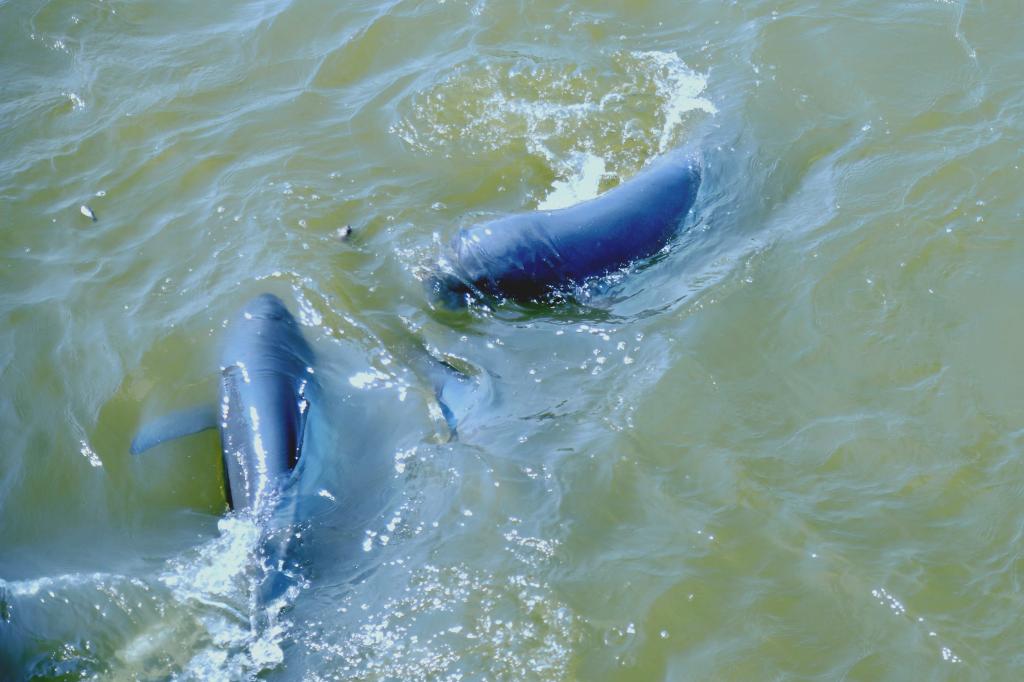 2018年5月16日,安徽省铜陵淡水豚国家级自然保护区内,两头江豚在争抢食物。(储著传 摄)