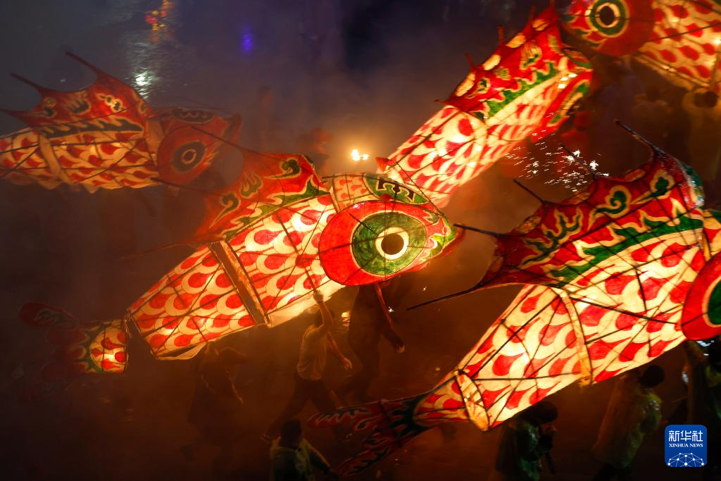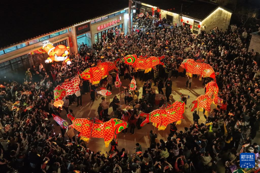 2月14日,在安徽省黄山市歙县北岸镇瞻淇村,鱼灯表演队在街巷中巡游。