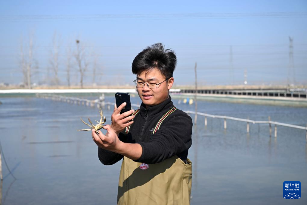 3月13日,在蚌埠市五河县申集镇黄李村的螃蟹养殖基地,朱彩胜在短视频平台和网友互动。