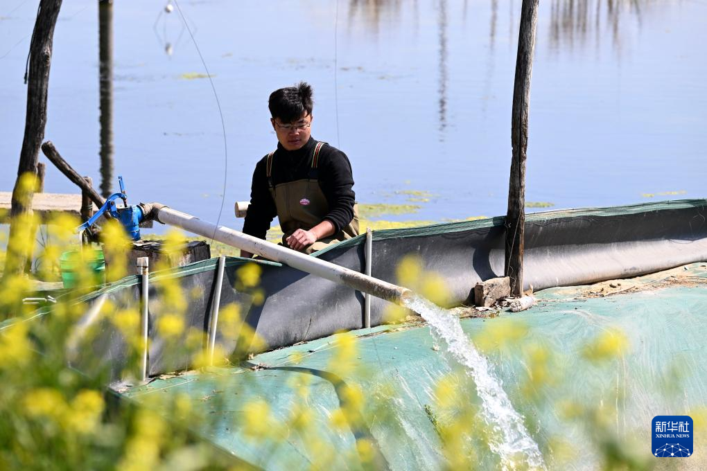 3月13日,在蚌埠市五河县申集镇黄李村的螃蟹养殖基地内,朱彩胜向蟹塘放水。